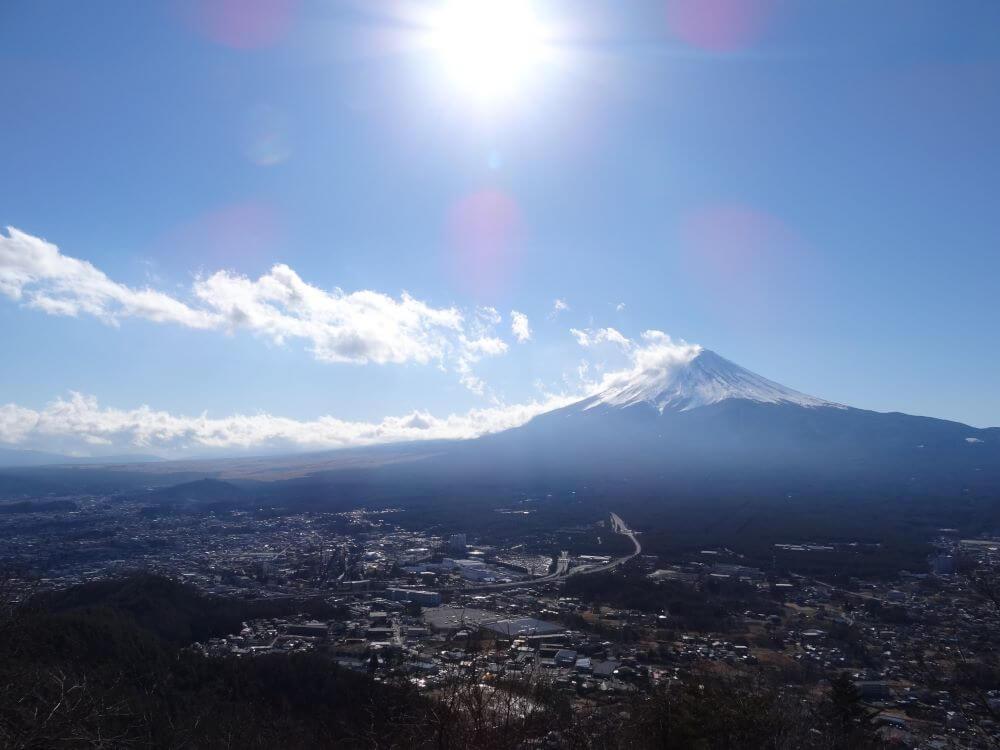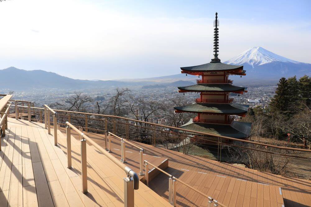 夜景100選にも選ばれるほどの有名な夜景スポットです。展望デッキから見る富士山と富士吉田市の街並みは美しく、夜は忠霊塔がライトアップされるのもポイントです。