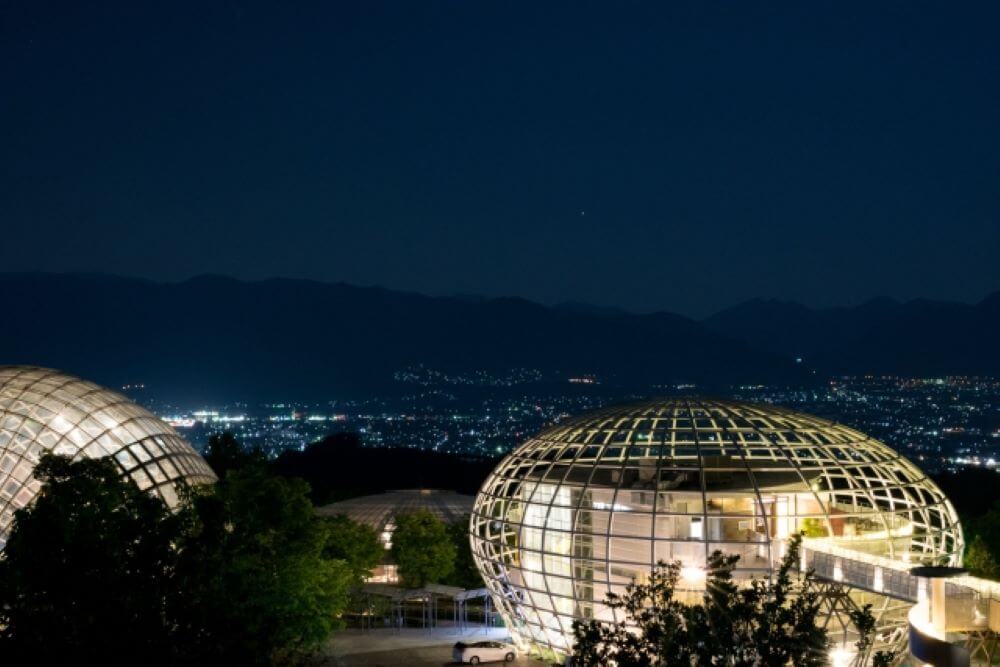 笛吹市にある「笛吹川フルーツ公園」は、園内にあるドーム型の建物と眼下の甲府盆地、そしてその奥に富士山も見える素晴らしい夜景が特徴です。新日本三大夜景の一つにも選ばれており、山梨県内でも屈指の夜景スポットといえるでしょう。