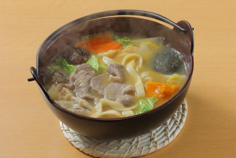 国道139号線沿いにあるほうとう専門店「ほうとう歩成」。お店名物の「黄金ほうとう」は、アワビの肝や京ダシで味わい深く仕上げた特製の味噌スープにカボチャの甘みが溶け込んだ逸品。夜景を見て冷えた時に食べる温かいほうとうは最高に美味しく感じますよ。
