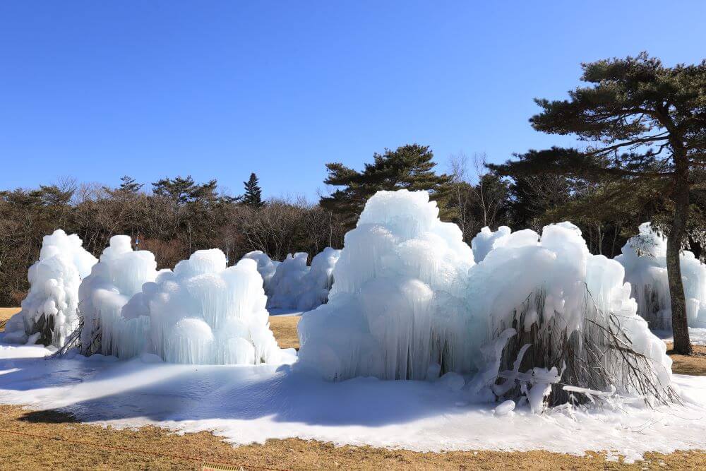 「西湖野鳥の森公園」は「西湖こおりまつり」の会場で、冬になると園内に多くの樹氷がつくられます。これらの樹氷は夜になるとライトアップされ、幻想的な氷の彫刻を見ることができます。