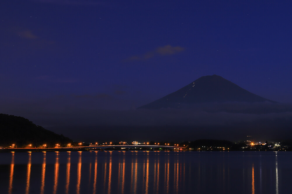 河口湖は富士五湖の中でも観光地化が進んでいる湖で、湖畔にはホテルなども多く建てられているため、夜になると建物の光が湖面に反射して幻想的な雰囲気になります。